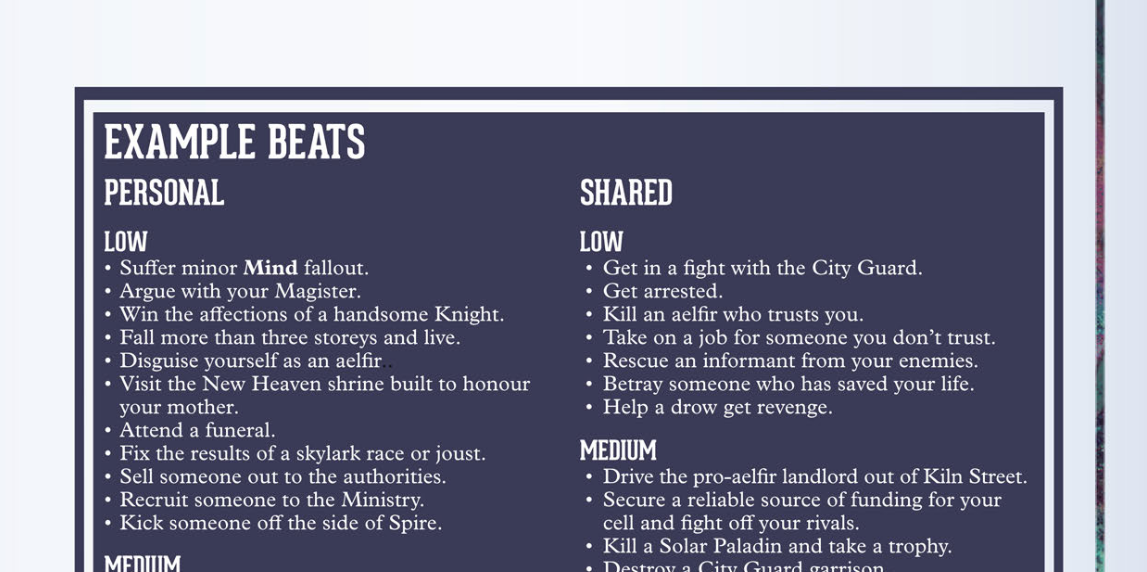 The Spire prerequisite for character progression - make a visible change in the City - stays in place, but it is extended with Beats [Magister's Guide #8]. Beats are basically intended events to happen to a character, chosen beforehand (two at a start of a session). They are not always good, positive events, but they allow to paint a desired storyline for a character, and develop their abilities at the same time.